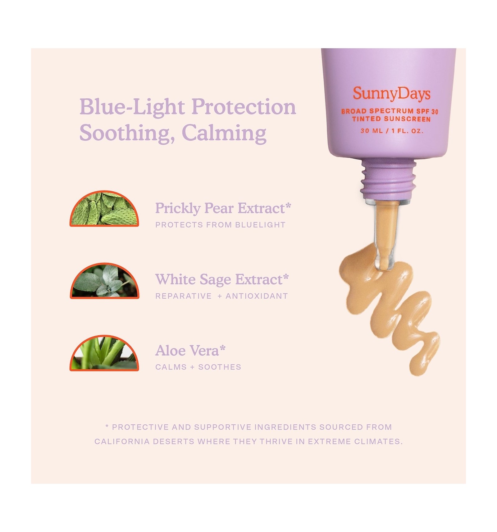 Non-Nano Zinc Oxide (protección solar), Prickly Pear Extract (repara y protege), White Sage Extract (minimiza irritación)