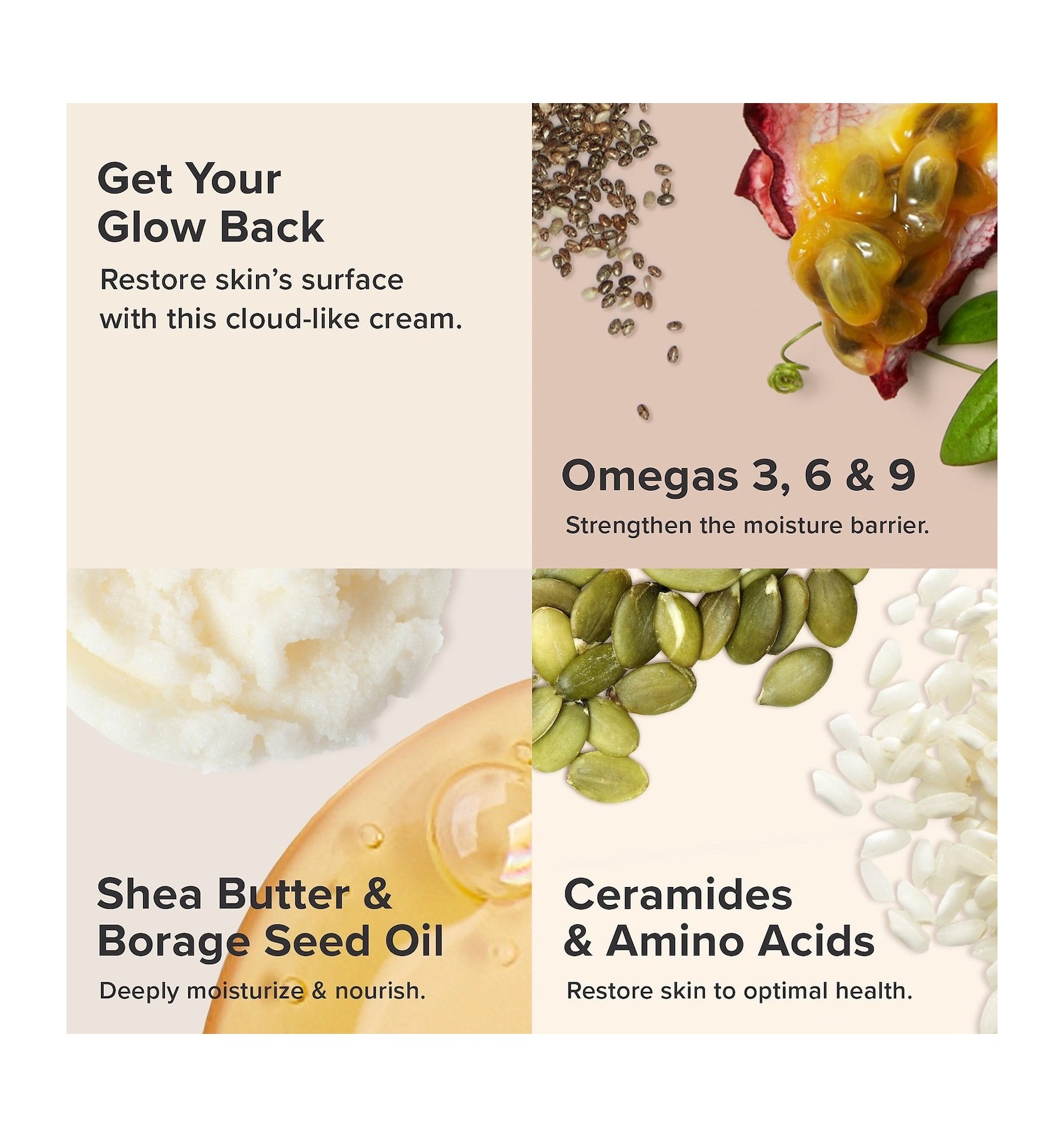 - Ácido Hialurónico, Ceramidas, Omegas, Boerhavia Diffusa, Manteca de Karité, Escualeno, Glicerina, Passiflora.